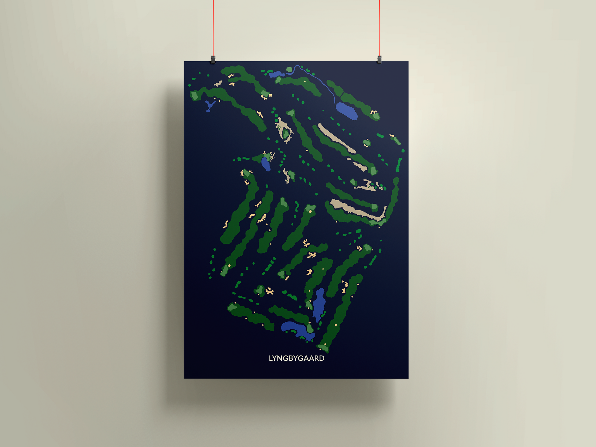 Plakaten viser det ikoniske layout fra Lyngbygaard – en golf plakat, der passer perfekt til enhver golfelsker, som vil mindes runderne, oplevelserne og de uforglemmelige øjeblikke på en kanon bane.